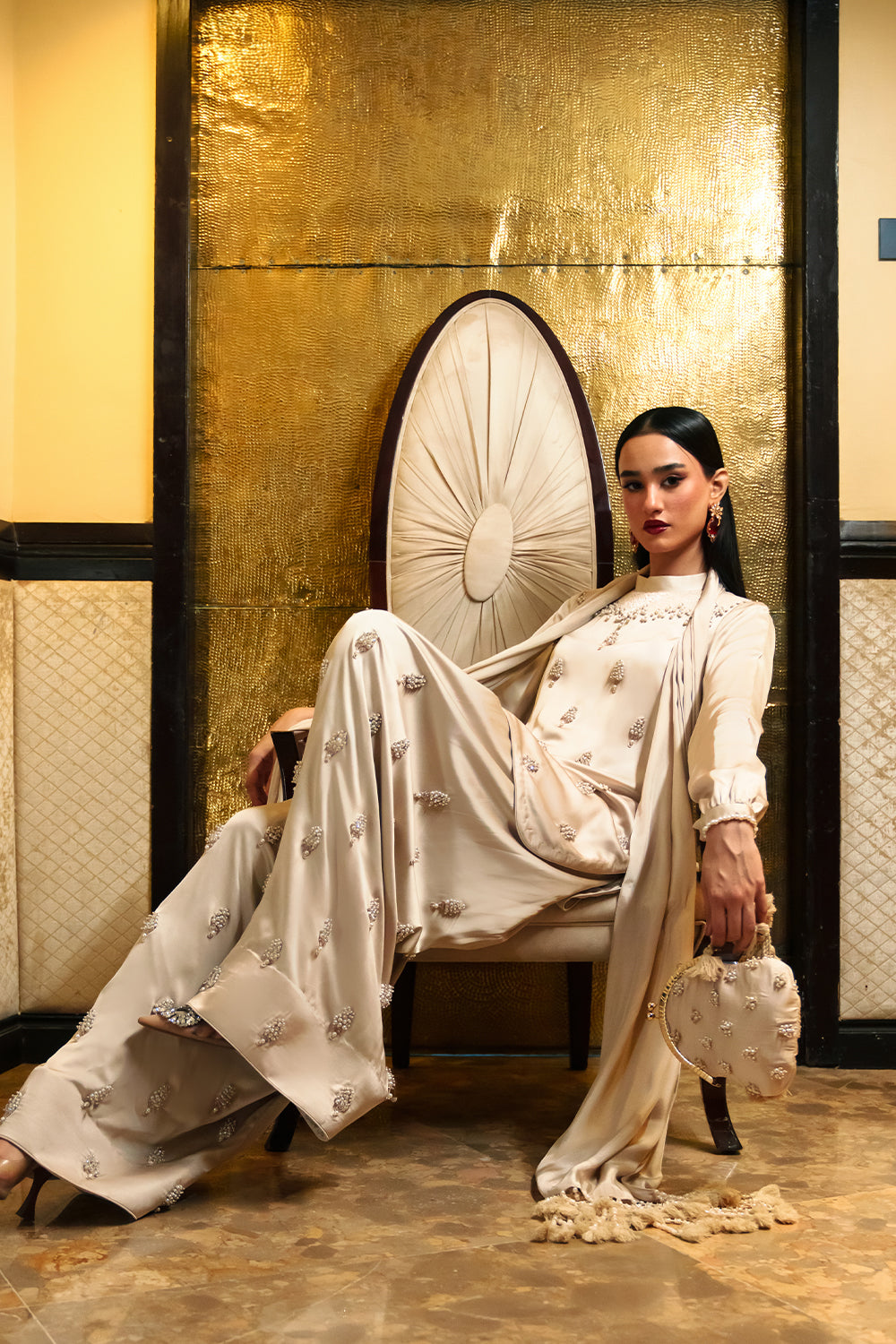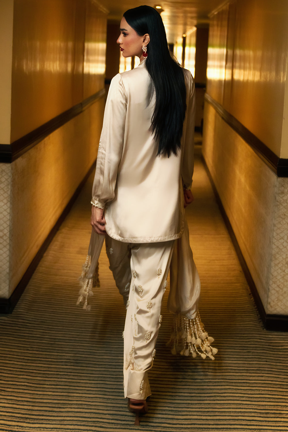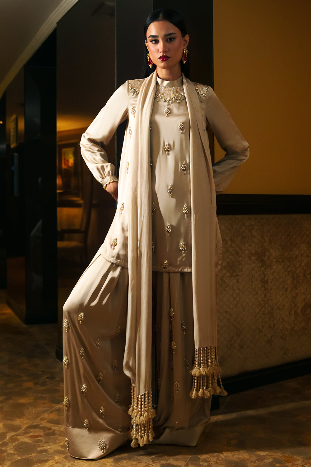 This piece of attire is refined shell toned silk ensemble that features a band neck tunic with a graceful back opening and cuffed sleeves. Paired with signature shalwar, this beautiful outfit is adorned with delicate handcrafts and detailing with baby pearls, mother of pearls, diamante and flat pipes. The final touch to this outfit is the exquisite silk duppatta with handmade tassels for a luxurious look.