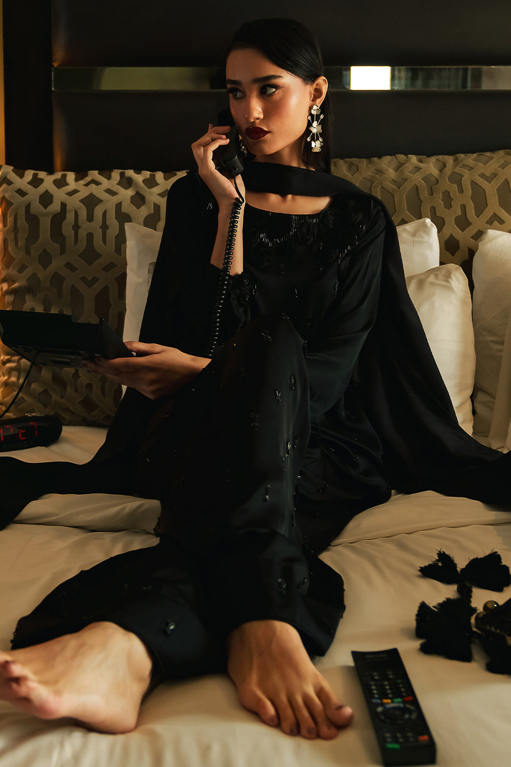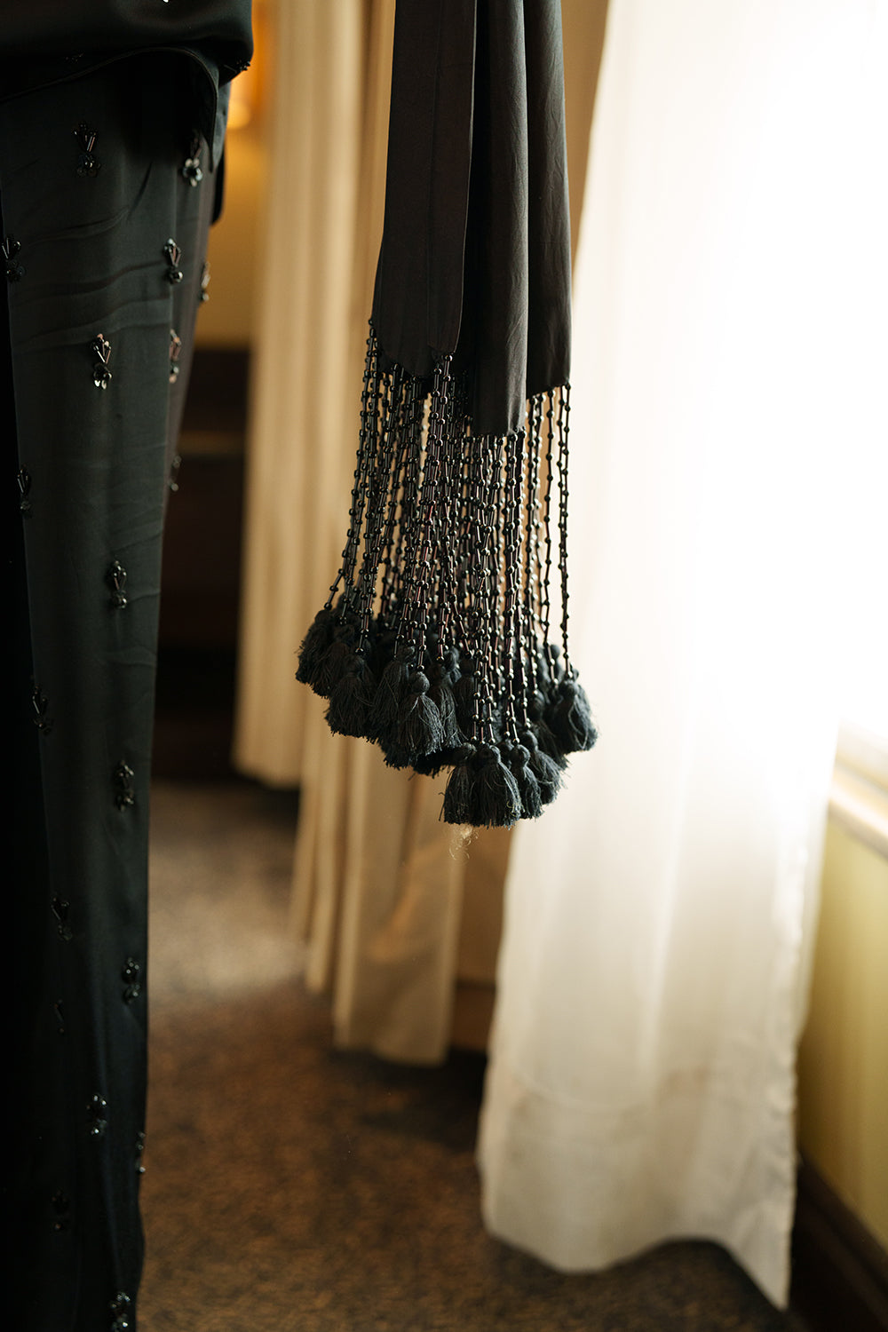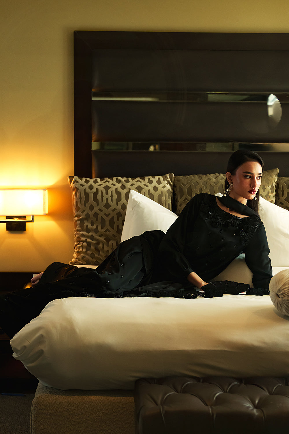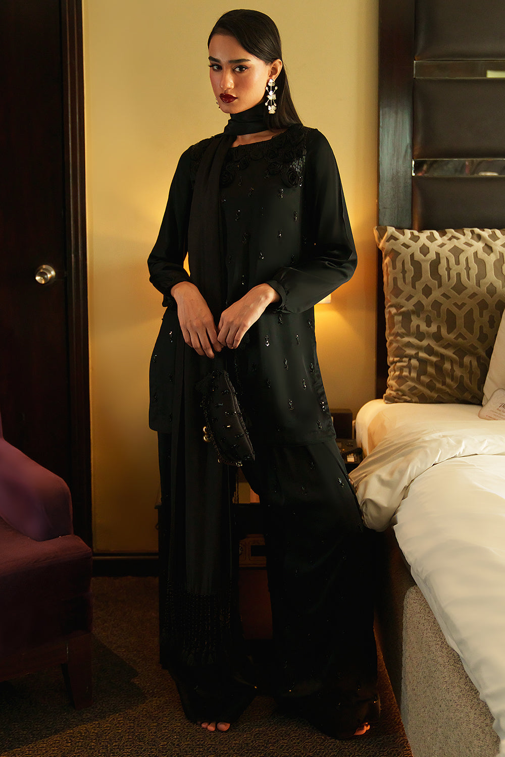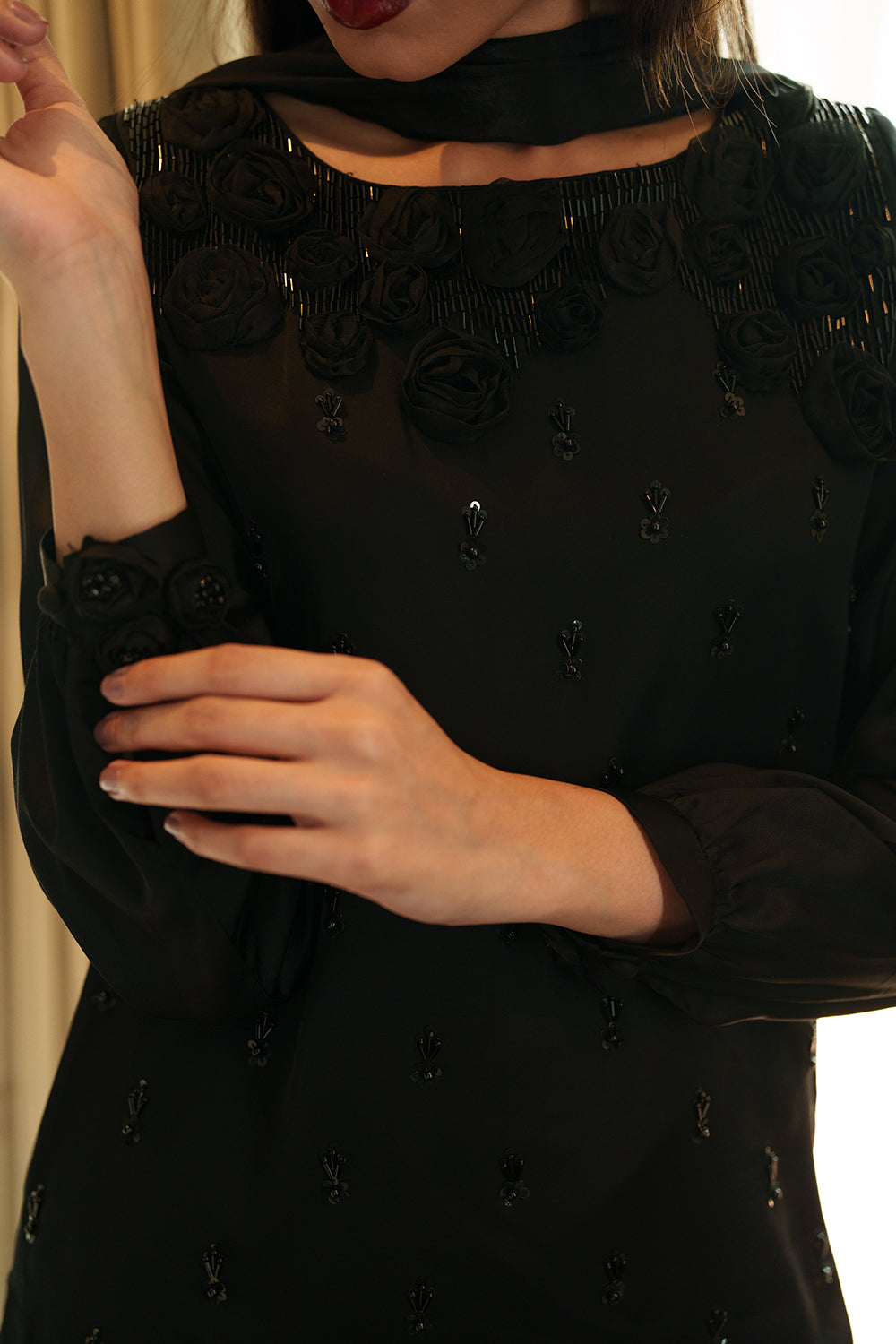 A majestic jet-black silk ensemble, perfectly handcrafted with flat pipes, sequins, pearls and delicate organza roses. The shirt features a graceful boat neckline with cuffed sleeves and paired with silk shalwar enhanced with a long silk drape and handcrafted tassels.